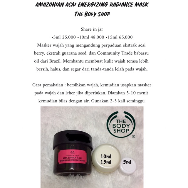 MASKER WAJAH THE BODY SHOP/ FACE MASK (share in jar 5ml 10ml 15ml) (Sumber : Shopee, Link : https://shopee.co.id/MASKER-WAJAH-THE-BODY-SHOP-FACE-MASK-(share-in-jar-5ml-10ml-15ml)-i.5054781.657429230)