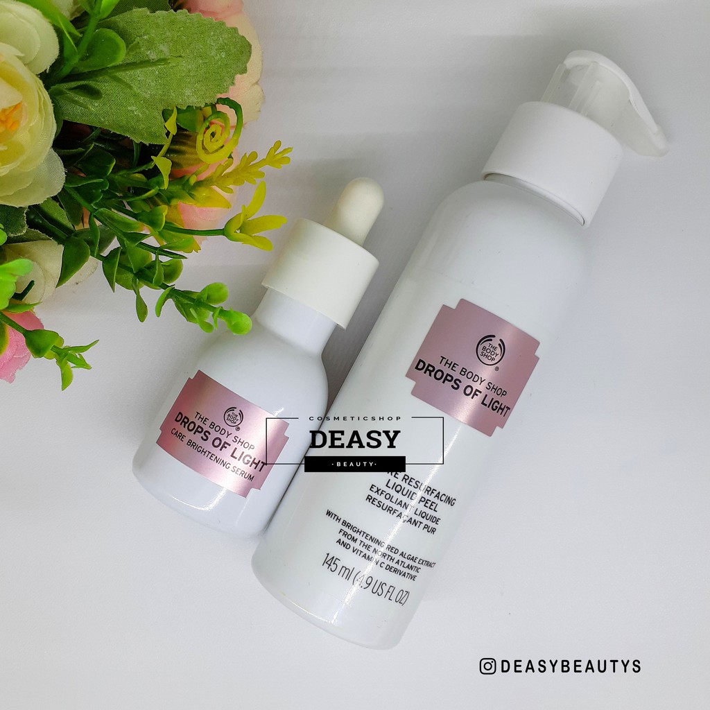 (Share in) The Body Shop Drops Of Light Pure Resurfacing Liquid Peel & Brightening Serum (Sumber : Shopee, Link : https://shopee.co.id/The-body-shop-DROPS-OF-LIGHT-BRIGHTENING-LIQUID-PEEL-145ML-i.2834939.8028688)