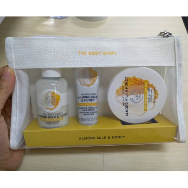 Almond Milk & Honey Gift Set The Body Shop (Sumber : Shopee, Link : https://shopee.co.id/THE-BODY-SHOP-ALMOND-MILK-GIFT-SET-FREE-POUCH-CP-199RB-SHOWER-GEL-i.26782932.1824946306)