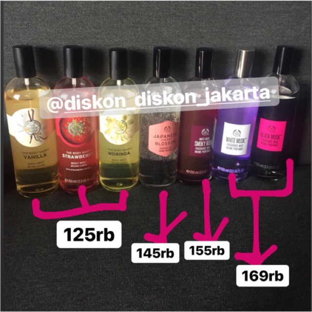 ORIGINAL WHITE MUSK FLORA /LEAU/JAPANESE CHERRY BLOSSOM/ VANILLA/MORINGA/BODY MIST THE BODY SHOP (Sumber : Shopee, Link : https://shopee.co.id/ORIGINAL-WHITE-MUSK-LEAU-JAPANESE-CHERRY-BLOSSOM-VANILLA-MORINGA-BODY-MIST-100ML-THE-BODY-SHOP-i.21727657.1192292403)