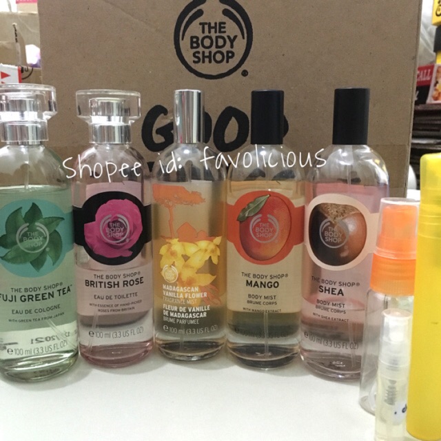 TBS Share in bottle edt body mist british rose fuji green tea strawberry satsuma moringa vanilla (Sumber : Shopee, Link : https://shopee.co.id/the-body-shop-eau-de-toilette-body-mist-cologne-british-rose-fuji-green-tea-share-in-botol-per-ml-i.9824368.2101845035)