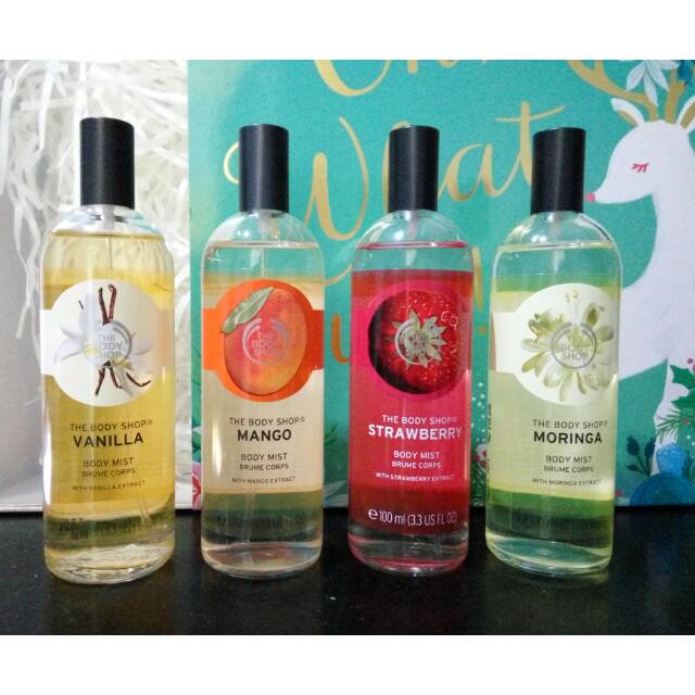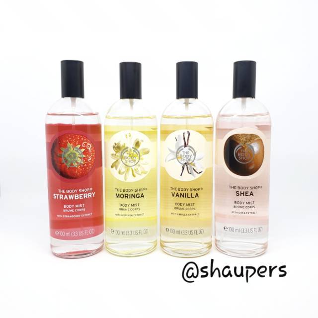 Strawberry/Moringa/Vanilla/Shea Body Mist 100ml The Body Shop (Sumber : Shopee, Link : https://shopee.co.id/Strawberry-Moringa-Vanilla-Shea-Body-Mist-100ml-The-Body-Shop-i.8069401.814994602)