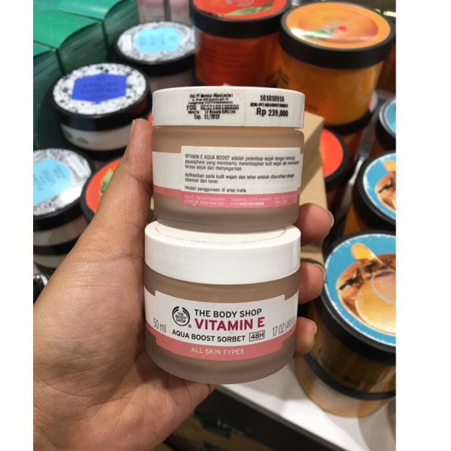 THE BODYSHOP VITAMIN E AQUA BOOST SORBET 50ml (Sumber : Shopee, Link : https://shopee.co.id/THE-BODYSHOP-VITAMIN-E-AQUA-BOOST-SORBET-50ml-i.51137324.2399852173)