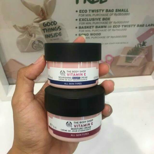 The Body Shop VITAMIN E Duo (Day Moisture Cream + Night Moisture Cream) (Sumber : Lazada, Link : https://www.lazada.co.id/products/the-body-shop-vitamin-e-duo-day-moisture-cream-night-moisture-cream-i551066165-s771024196.html)